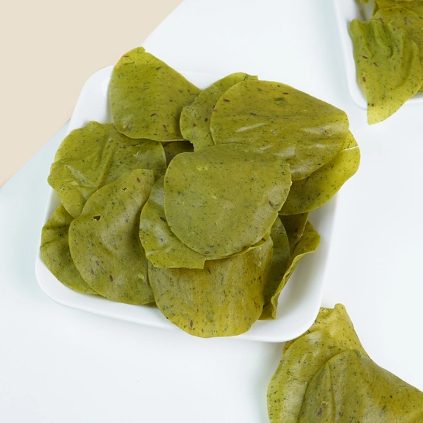 Khichiya Papad (also called khichu papad) is a traditional rice‑flour cracker flavored with cumin and optionally chili or garlic. It’s thin, crunchy, and can be enjoyed roasted, fried, or topped with fresh veggies and chutneys for a masala-laden snack.